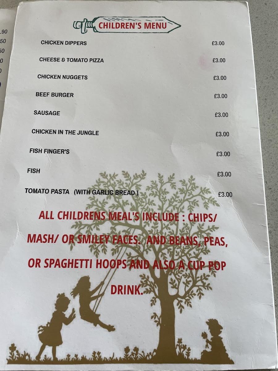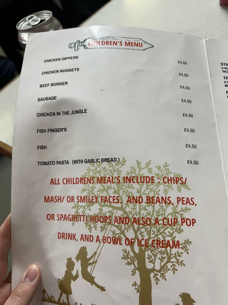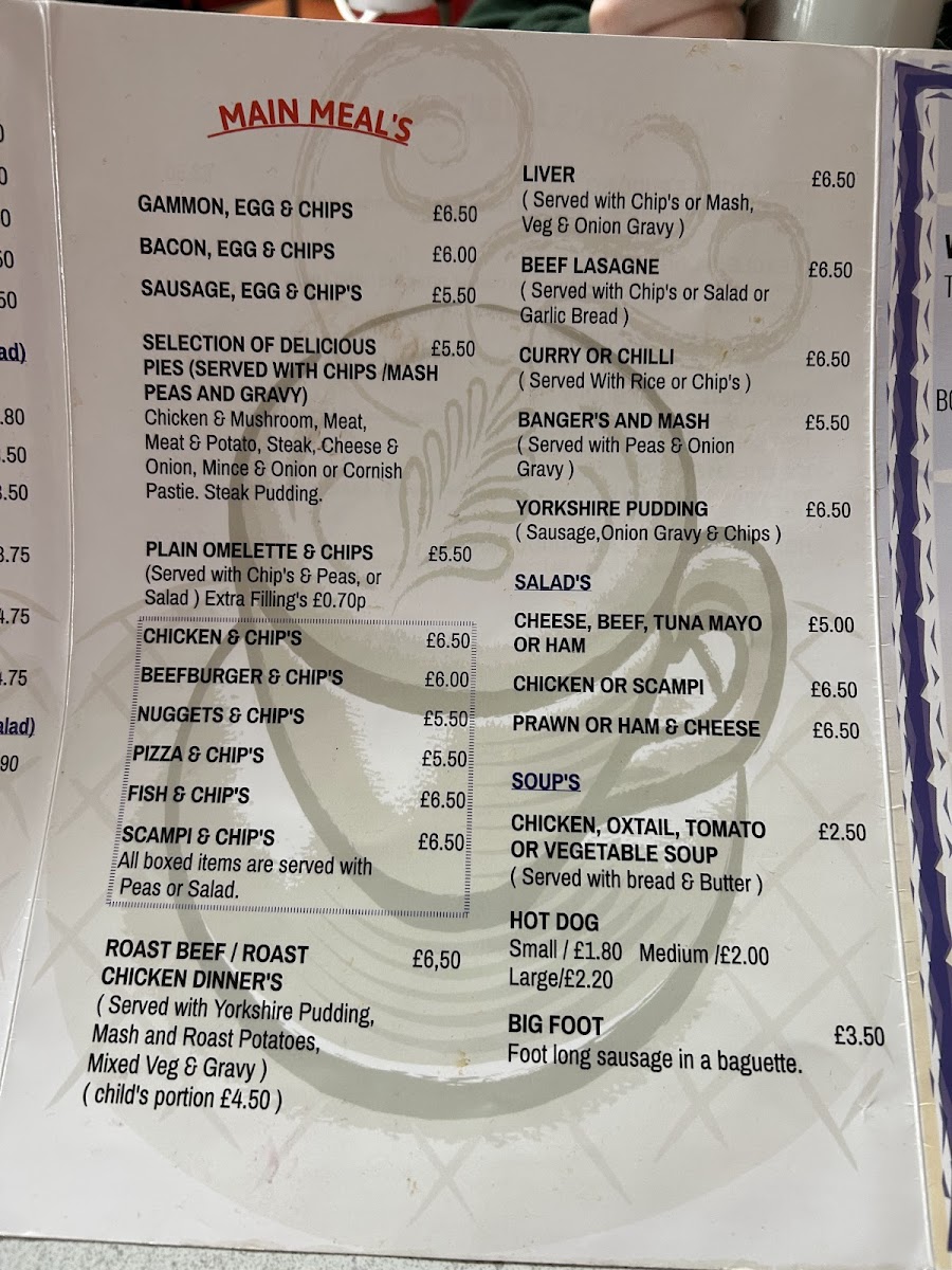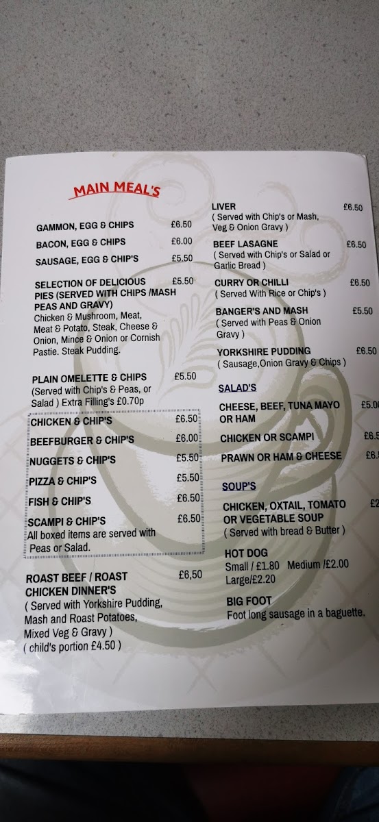 The menu features a range of hearty choices suited for mornings and early afternoons. Favorites include breakfast plates with eggs, bacon, and chips, alongside lighter bites like jacket potatoes with various toppings and fresh salads. Casual meals such as cheeseburgers with chips or chicken nuggets provide easy options for a midday break. On the drinks side, expect milky coffees, hot chocolates, and a selection of teas, all served to complement a relaxed dining experience.